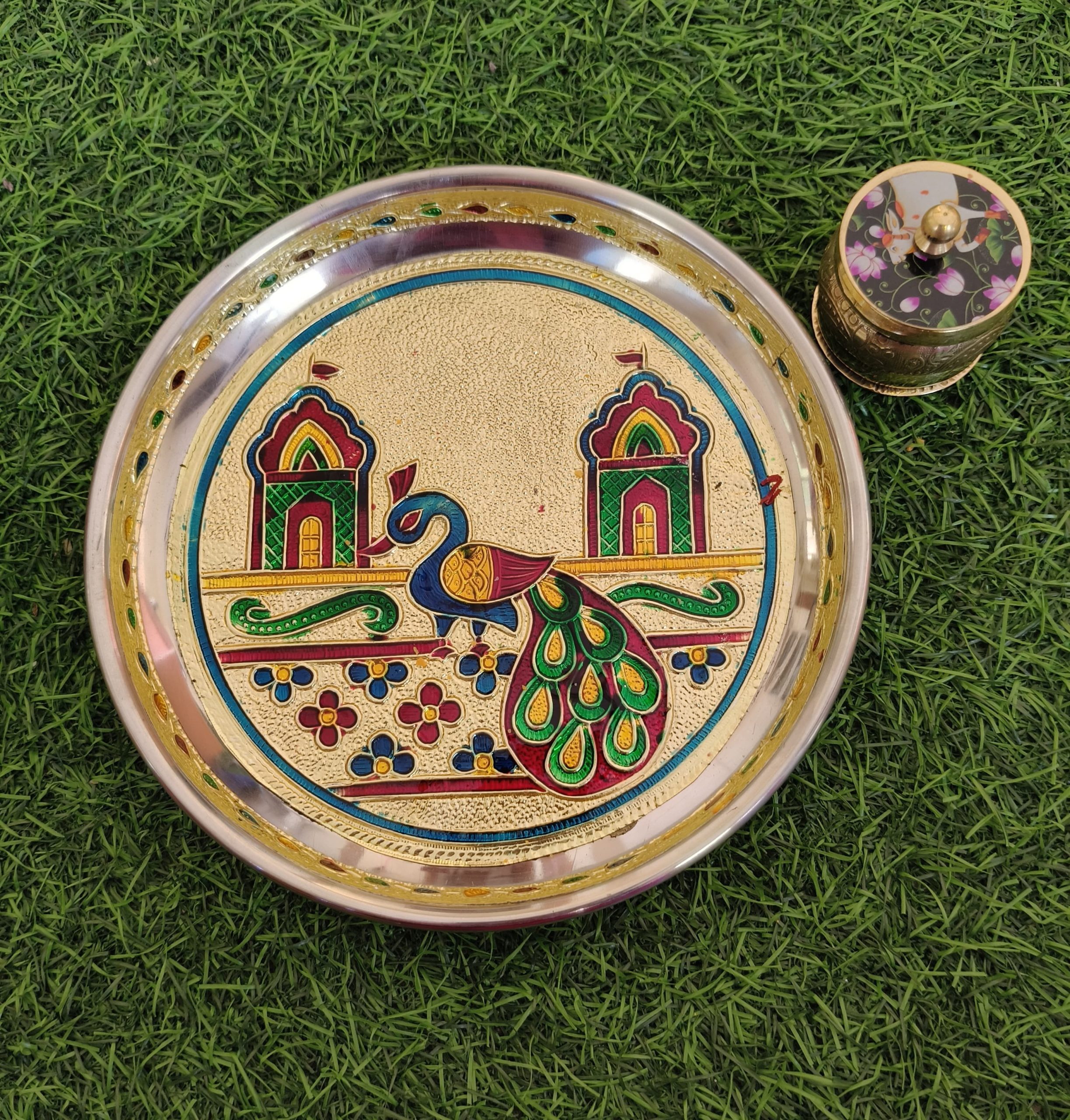 Bring home the elegance of tradition with this beautifully handcrafted Meenakari Plate and Kumkum Box Combo. Perfect for pooja rituals, festive celebrations, and gifting, this set is adorned with intricate Meenakari work that reflects rich Indian craftsmanship.